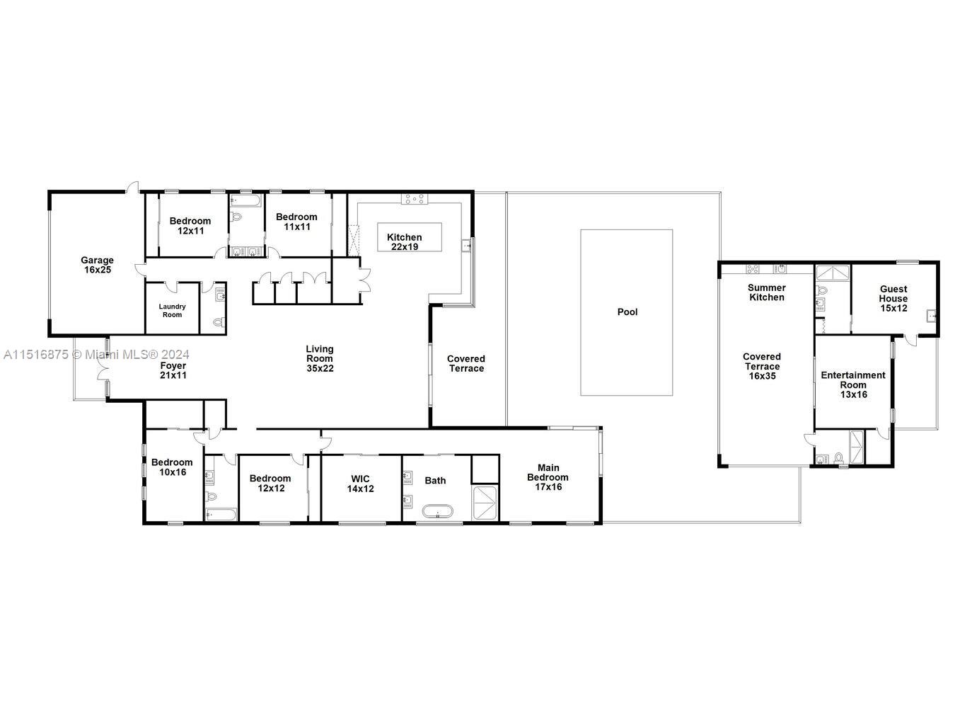 Introducing an exquisite, newly built 2024 estate home located in Glenvar Heights, sprawling across a 21,700 sq ft lot. Upon entering, the striking 16-foot ceilings & a plethora of windows draw attention, bathing the space in natural light. The residence features luxurious 48 * 48 matte porcelain flooring throughout. The gourmet kitchen is equipped with Thermador appliances, quartzite countertops, & a large island, all overlooking the pool, outdoor kitchen, cabana bath, & flex room. A discreet entrance opens to a 1 bed/1 bath in-law suite, positioned behind the flex space suitable for a gym/game room. The primary suite serves as a sanctuary of opulence, with an expansive walk-in closet & bathroom that boasts custom dual vanities, a soaking tub, a dual walk-in shower, & a secluded toilet.